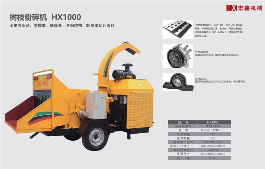 广泛应用于造纸、密度板、生物质电厂、园林修剪、枝柴切碎等工业生产中的备料工段。主要原料是原木、树枝、小径木、木材采伐剩余料。该机机构简单,构造坚固、操作方便、工作高效、原料适应范围广,设备易于维护和运输,具有高的生产率和安全性。