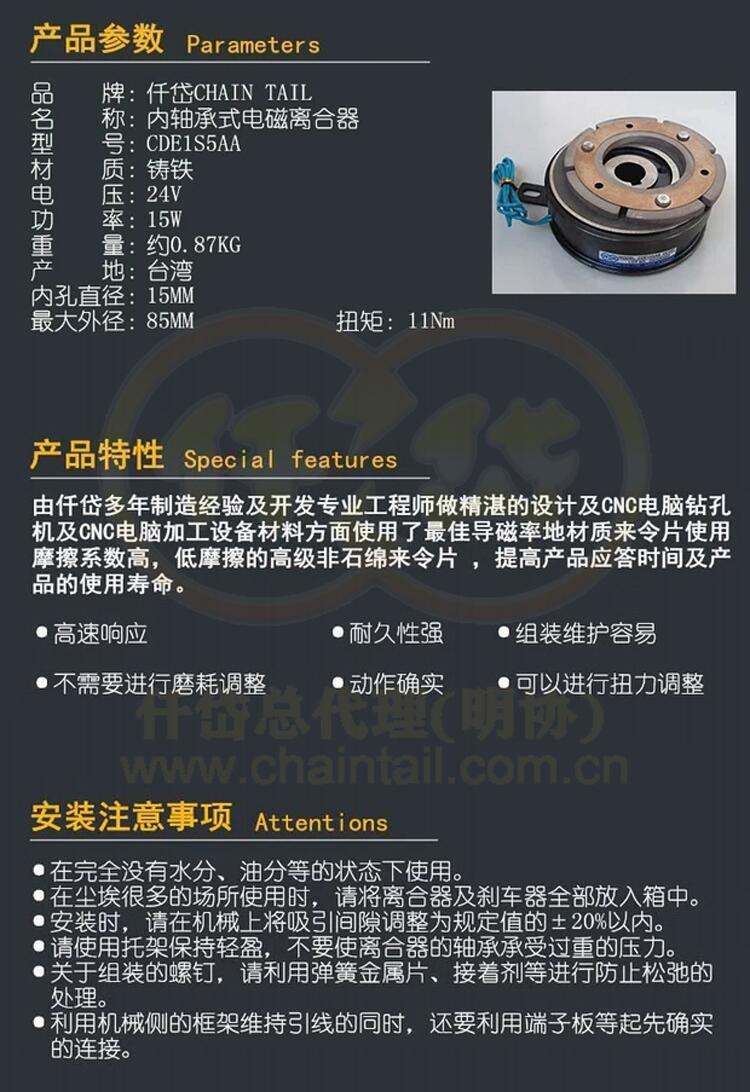 电磁离合器CDE1S5AB,工作电压DC24V,功率15W,属于干式单板内轴承式电磁离合器。台湾仟岱有限公司CHAIN TAIL生产,其同规格加大扭力型号为CDE1S5AF,旧型号为CDE1S5AA/CD-E-1.5。产品的响应速度非常快,使用非石棉高等级耐摩擦来令片,磨耗相当低,使用寿命长。