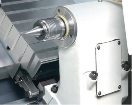 > GLS-1500L 系列可选用 5.5 kW ( 7 HP, 5 分 ) 之 FANUC 内藏式马达驱动副主轴来进行背面加工,副主轴搭配 5 吋夹头并内置顶料装置以让完工之工件能顺利脱离夹爪而落入工件接收器内。