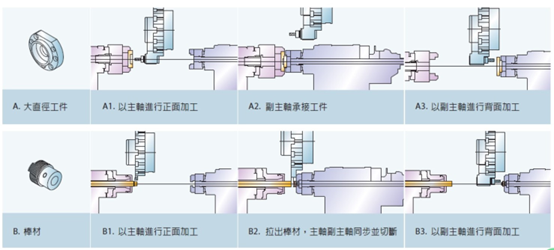 > 副主轴以等转速同期控制下,从主轴精确地承接工件,再进行工件背面端的第二工程,不但可节省转运人力,而且降低工件二次定位设定之时间与精度误差。