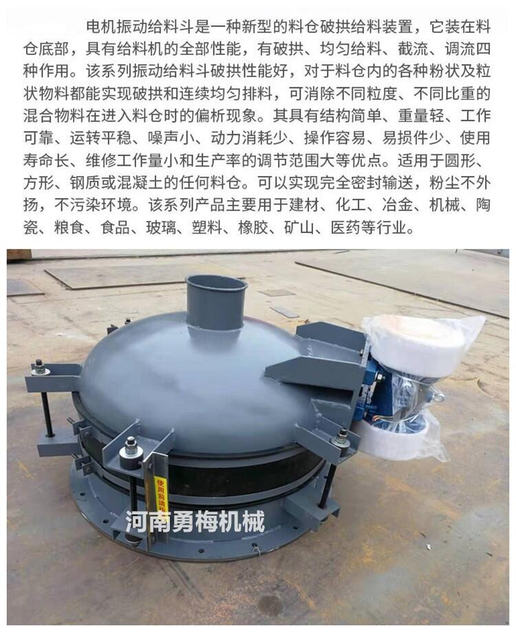 河南勇梅机械活化料斗 储料罐配套活化器可消除不同粒度和比例的混合物的偏析。活化料斗一台或两台振动电机安装在活化料斗侧面,振动给料斗是一种新型的料仓破拱给料装置,它装在料仓底部,用作破拱和均匀给料。振动给料斗破拱性能好,对于料仓内的各种粉状及粒状物料都能实现破拱和连续均匀排料,可消除不同粒度、不同比重的混合物料在进入料仓时的偏析现象。
