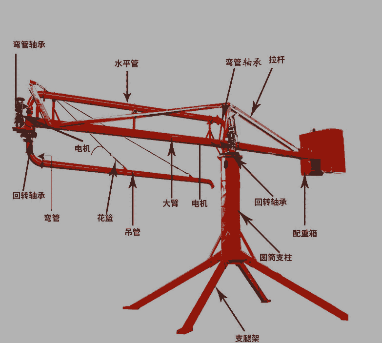 工地上混凝土输送都开始采用混凝土布料机,这样就快速提升了混凝土输送的效率1.泵管布料机布料杆安放在架体上时要用架管将支腿压实,安装在楼地面上时可不用。2.用缆风绳将布料杆进行四脚固定,缆风绳不要太紧,应留出布料杆受力变形的距离。3.检查布料杆的螺栓是否全部上紧,转轴处是否正常。4.搭设泵管布料机布料杆安放位置的架体,并进行检查验收,计算受力部位的架体承受能力、双扣件的加固情况、地基的平稳情况。5.安放布料杆及其配重,要求布料杆中间必须架空200~300mm,支脚下面铺垫枕木或木方,检查布料杆杆身是否垂直。