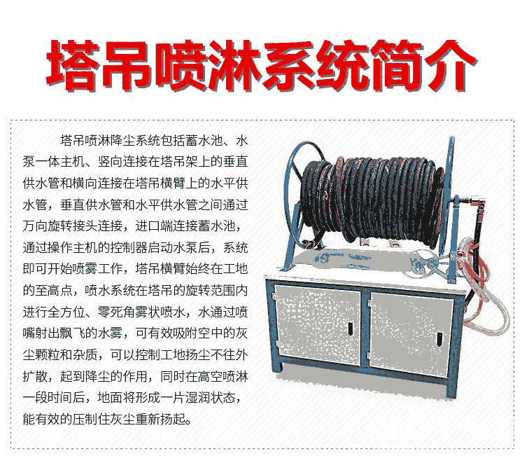 中跃机械塔吊喷淋降尘系统包括蓄水池、水泵一体主机、竖向连接在塔吊架上的垂直供水管和横向连接在塔吊横臂上的水平供水管,垂直供水管和水平供水管之间通过万向旋转接头连接,进口端连接蓄水池,通过操作主机的控制器启动水泵后,系统即可开始喷雾工作,塔吊横臂始终在工地的至高点,喷水系统在塔吊的旋转范围内进行、零死角雾状喷水,水通过喷嘴射出飘飞的水雾,可有效吸附空中的灰尘颗粒和杂质,可以控制工地扬尘不往外扩散,起到降尘的作用,同时在高空喷淋一段时间后,地面将形成一片湿润状态,能有效的压制住灰尘重新扬起。