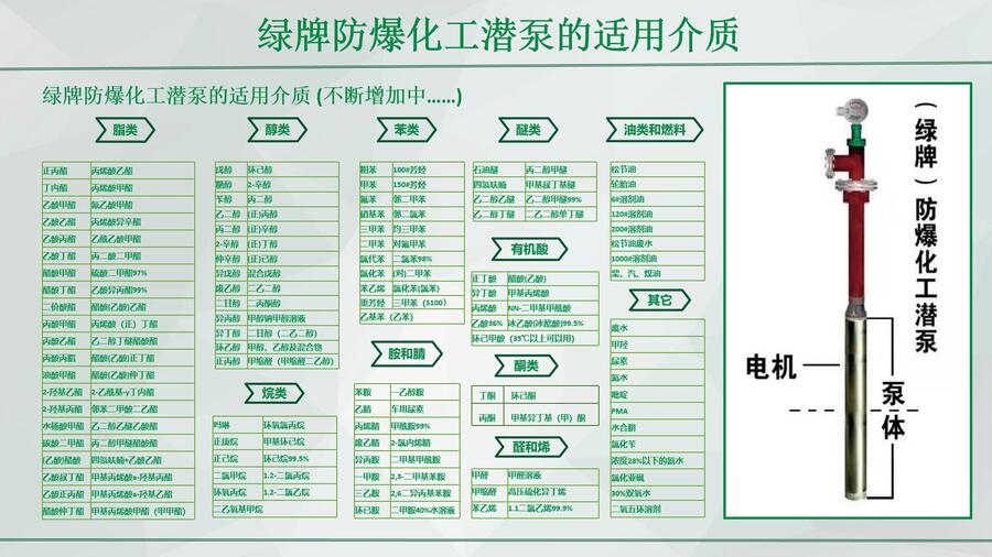绿牌化工潜泵输送原理由传统的“陆上负吸”改为“液下正推”,解决了传统产品始终存在的气阻、气蚀等难题。不产生废气,节能环保、终身免维护不影响生产,质保5年,设计寿命十几年。可输送170多种化工介质,先后于两百多家设计院达成合作上图,并在中石油、中石化、中航油、等油品企业获得入围资格。