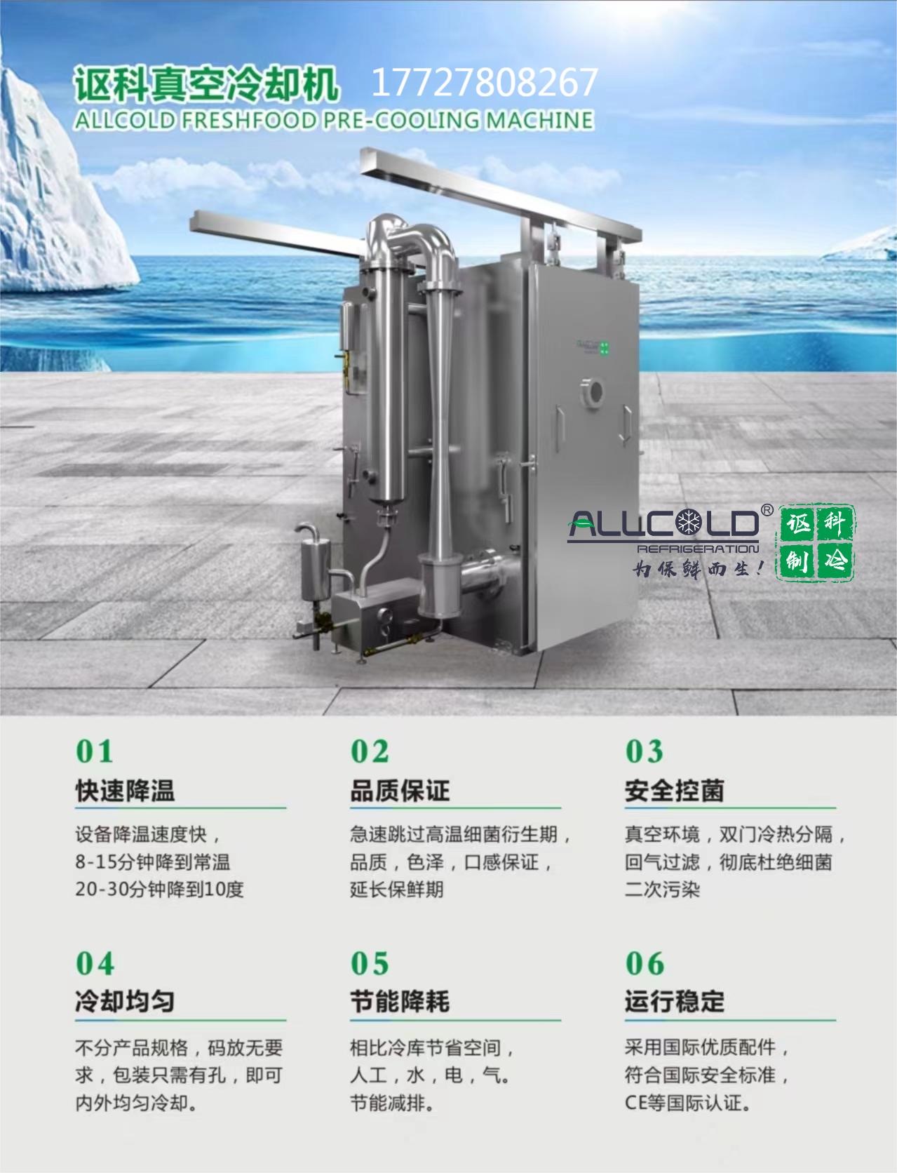 将出炉的高温熟食品置于真空箱内,在真空状态下通过食品水分快速蒸发吸热,从而达到快速冷却的效果,这种快速的冷却方式可避开食品微生物繁殖的60℃至30℃区间温度。