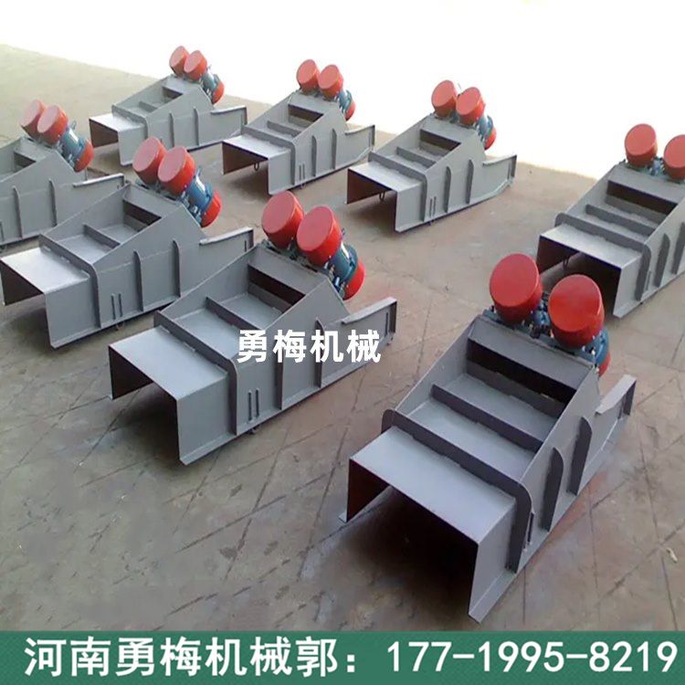 GZG系列给料机的给料过程是利用特制的振动电机或两台电动机带动激振器驱动给料槽沿倾斜方向作周期直线往复振动来实现,当给料槽振动的加速度垂直分量大于重力加速度时,槽中的料被抛起,并按照抛物线的轨迹向前跳跃运动,抛起和下落在瞬间完成,由于激振源的连续激振,给料槽连续振动,槽中的煤连续向前跳跃,以达到给料的目的。
