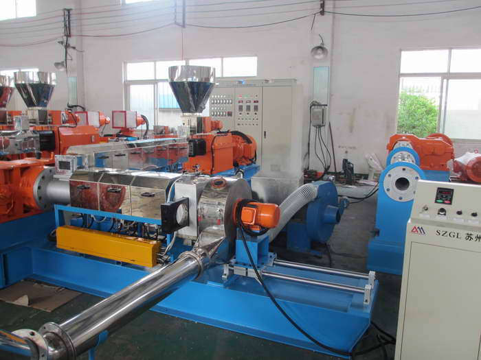 橡胶促进剂母粒造粒机---橡胶促进剂母粒造粒设备===橡胶促进剂母粒造粒生产线密炼机----提升机------双腕喂料机---------单螺杆造粒机-------隔离剂喂料系统----对吹热切机头-----一JI旋风分离器------二级旋风分离器-------隔离剂回收系统-------加长风冷振动筛------成品料仓