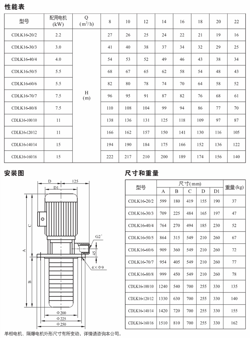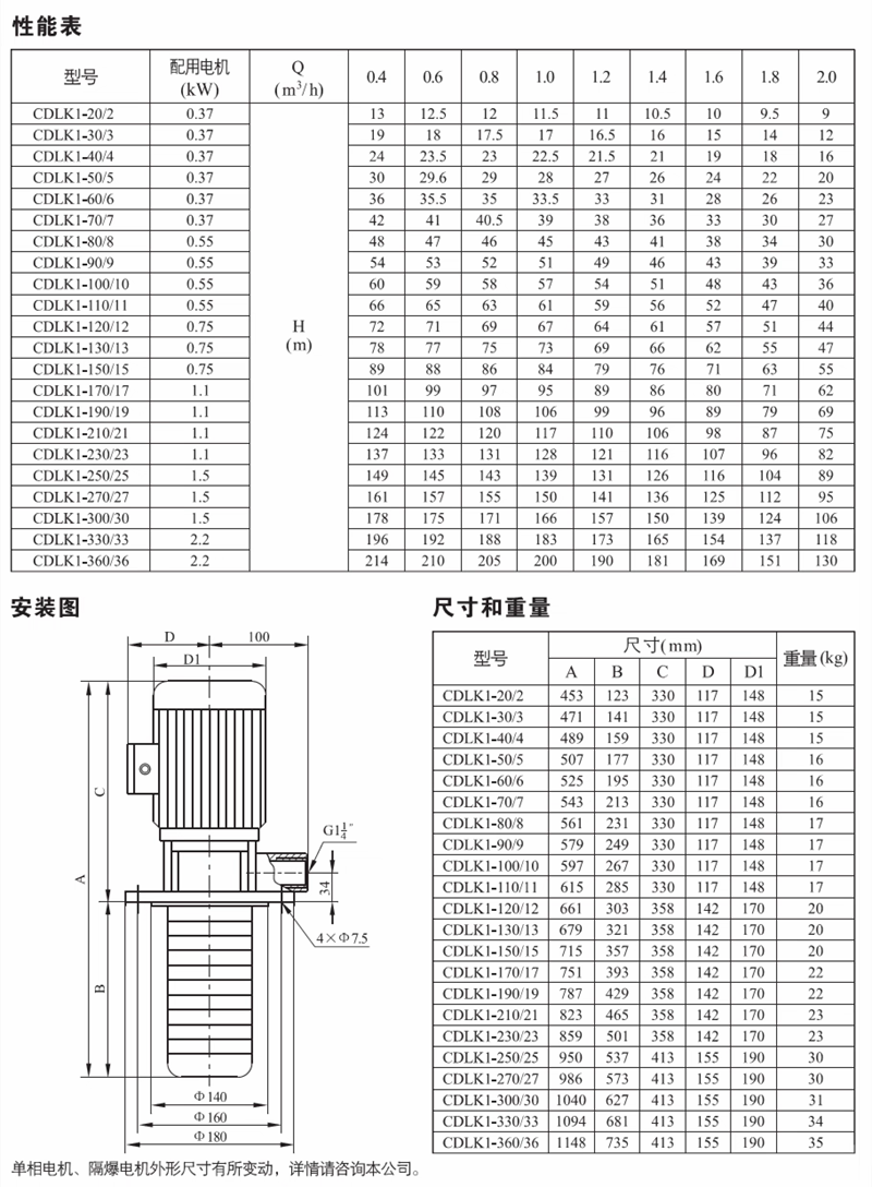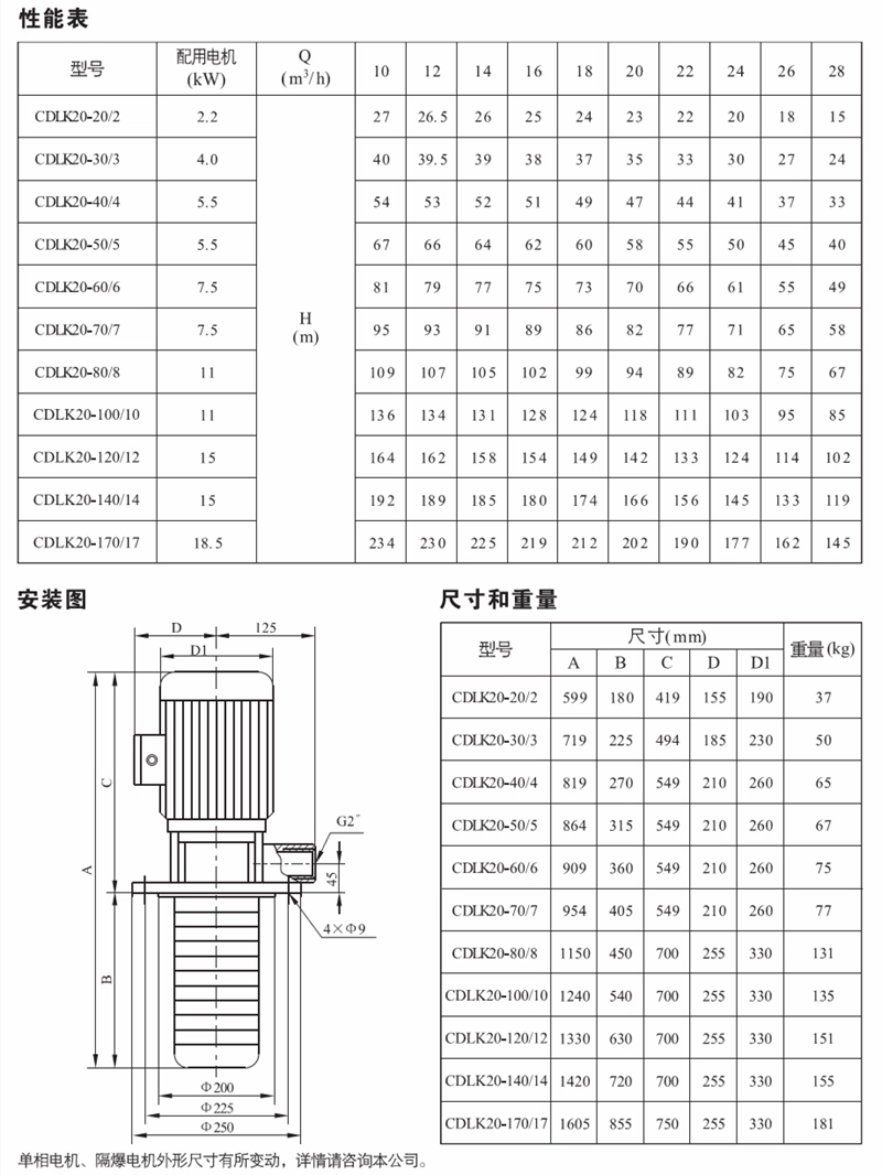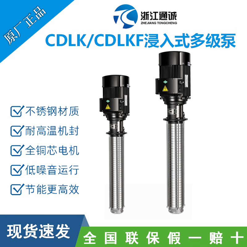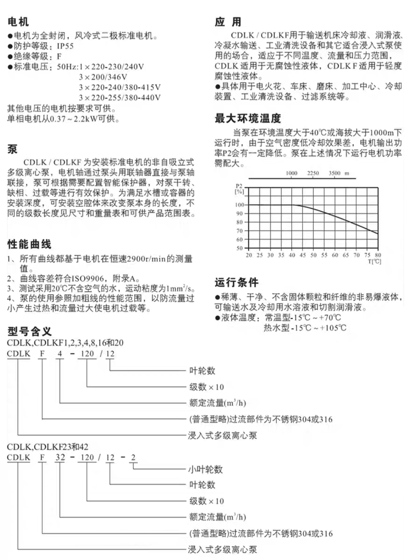 CDLK/CDLKF为安装标准电机的非白吸浸入式多级离心泵,电机轴通过泵头用联轴器直接与泵轴联接,泵可根据需要配置智能保护器,对泵干转、缺相、过载等进行有效保护。为满足水槽或容器的安装深度,可安装空腔体来改变泵本身的长度,不同的级数长度见尺寸和重量表和可供产品范围表。应用于输送机床冷却液,润滑液,冷凝水输送,工业清洗设备和其它适合浸入式泵使用的场合,适应于不同温度、流量和压力范围,CDLK适用于无腐蚀性液体,CDLKF适用于轻度腐蚀性液体。