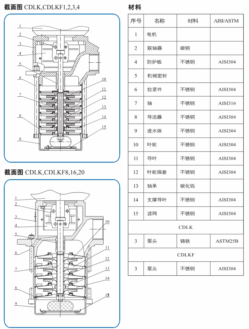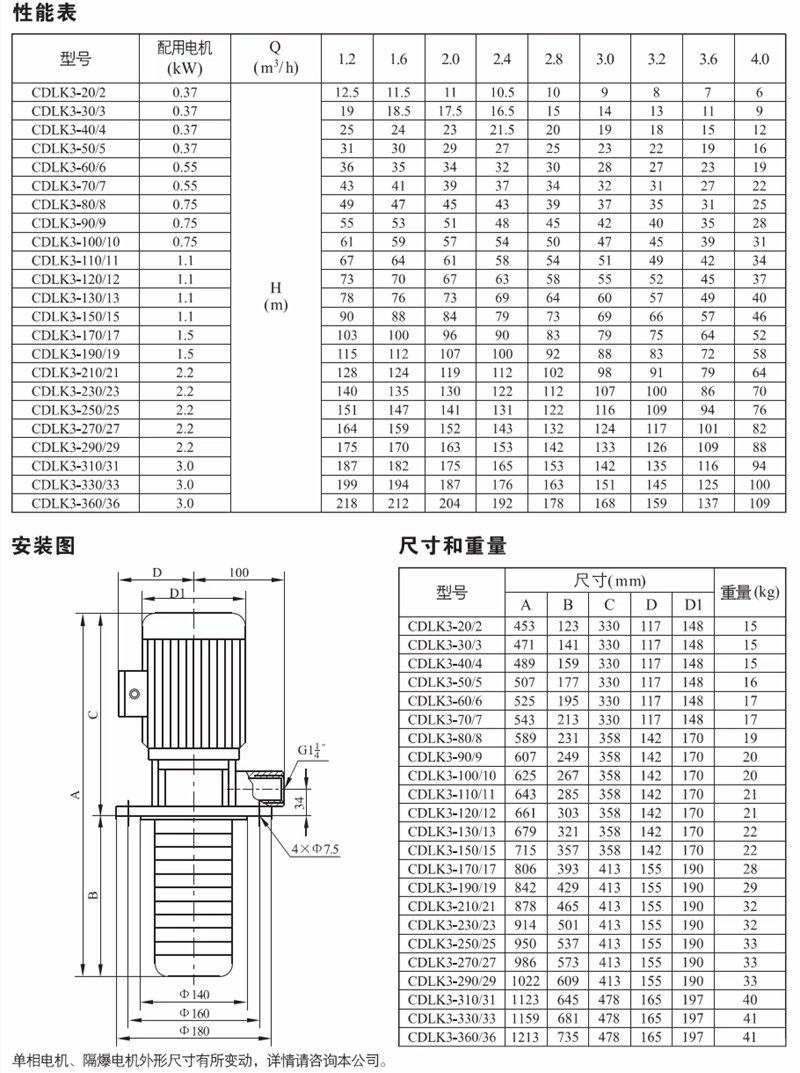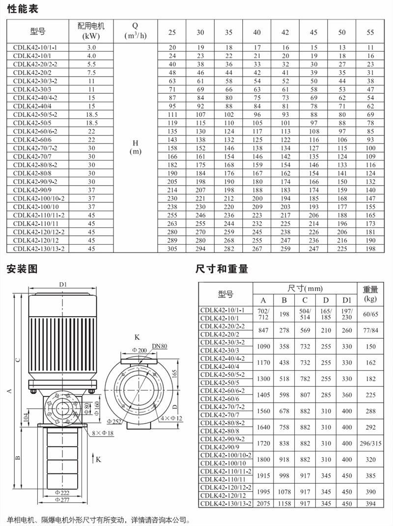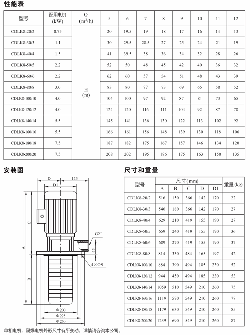 CDLK/CDLKF为安装标准电机的非白吸浸入式多级离心泵,电机轴通过泵头用联轴器直接与泵轴联接,泵可根据需要配置智能保护器,对泵干转、缺相、过载等进行有效保护。为满足水槽或容器的安装深度,可安装空腔体来改变泵本身的长度,不同的级数长度见尺寸和重量表和可供产品范围表。应用于输送机床冷却液,润滑液,冷凝水输送,工业清洗设备和其它适合浸入式泵使用的场合,适应于不同温度、流量和压力范围,CDLK适用于无腐蚀性液体,CDLKF适用于轻度腐蚀性液体。