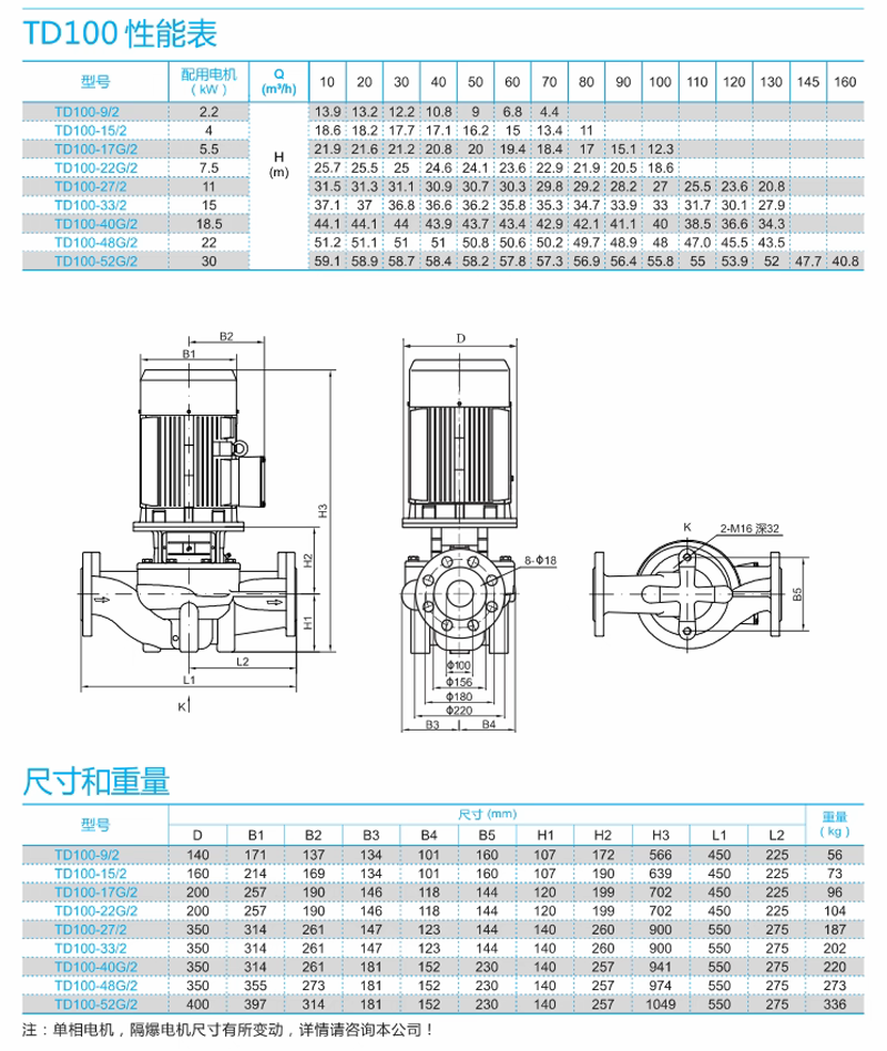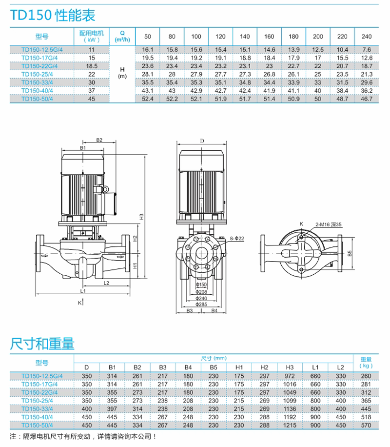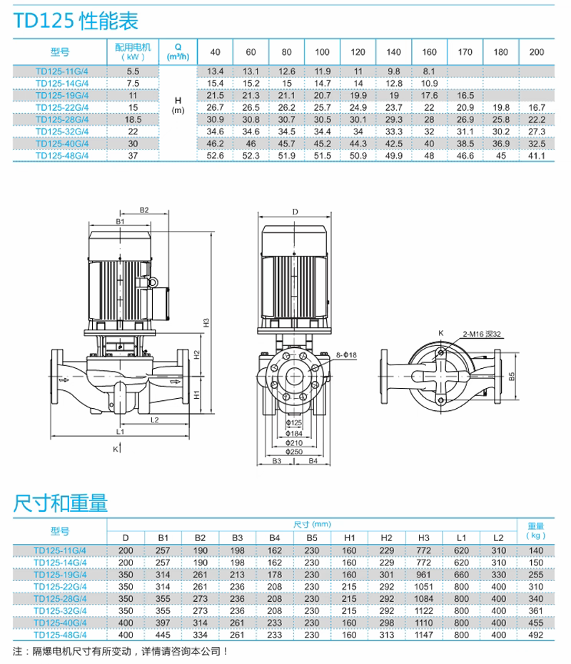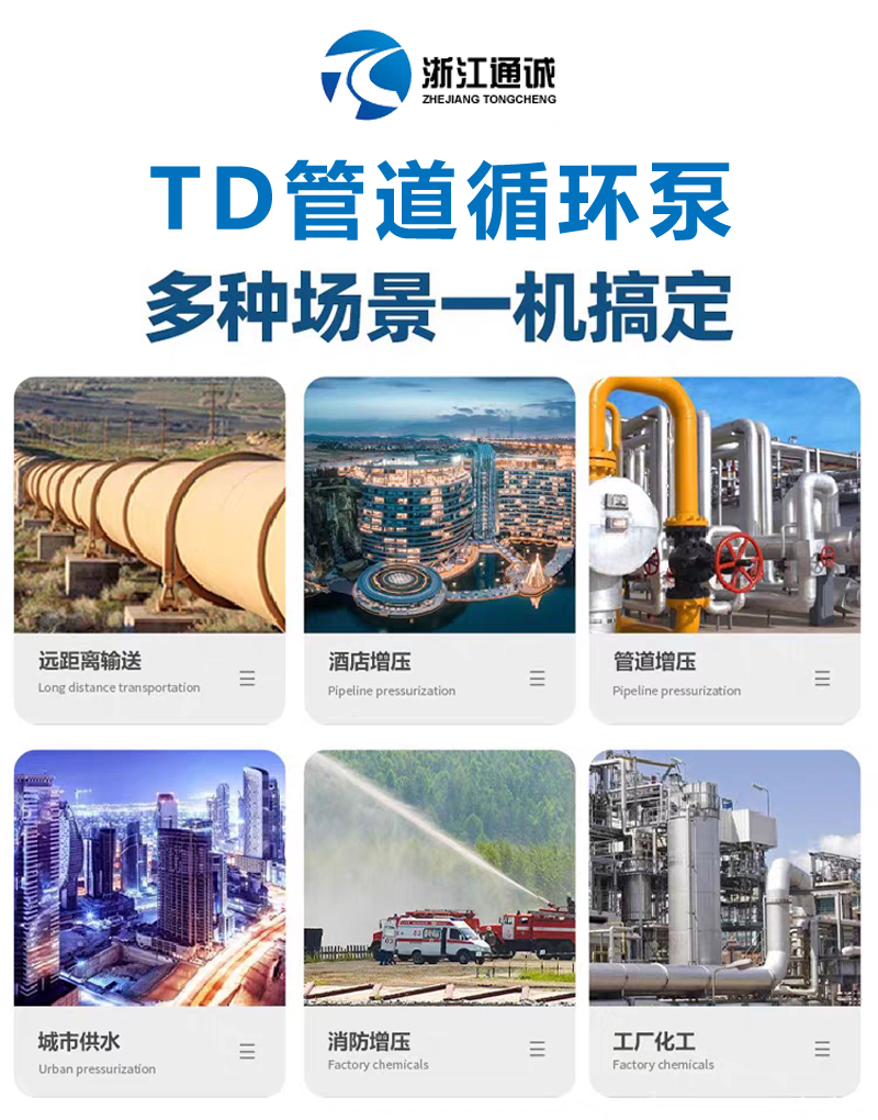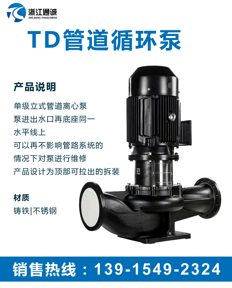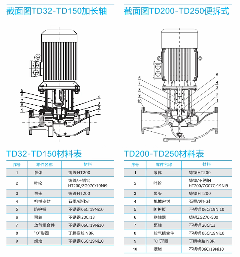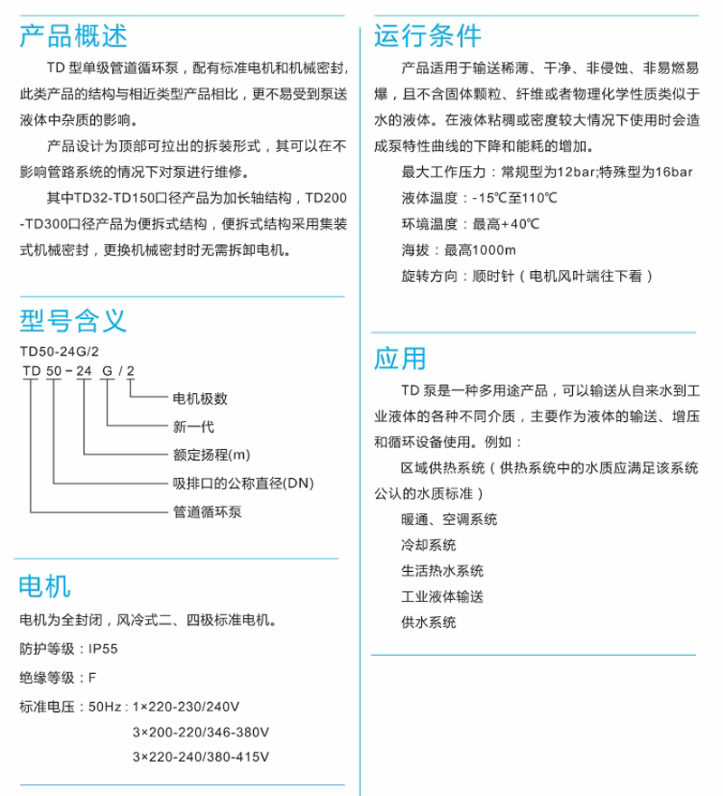 配有标准电机和机械密封,此类产品的结构与相近类型产品相 比,更不易受到泵送液体中杂质的影响。 产品设计为顶部可拉出的拆装形式,其可以在不影响管路系统的情况下对泵进行维修。 TD125和TD150产品同时提供加长轴结构和便拆式结构,TD200以上产品全部采用便拆式结构,更换机械密封无需拆卸电机。