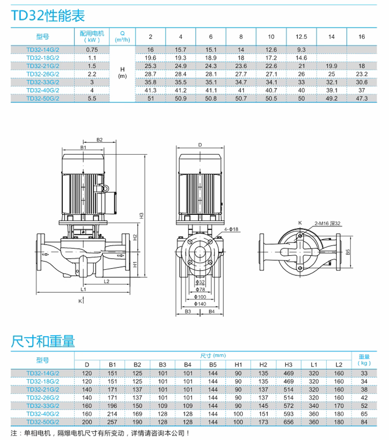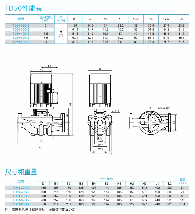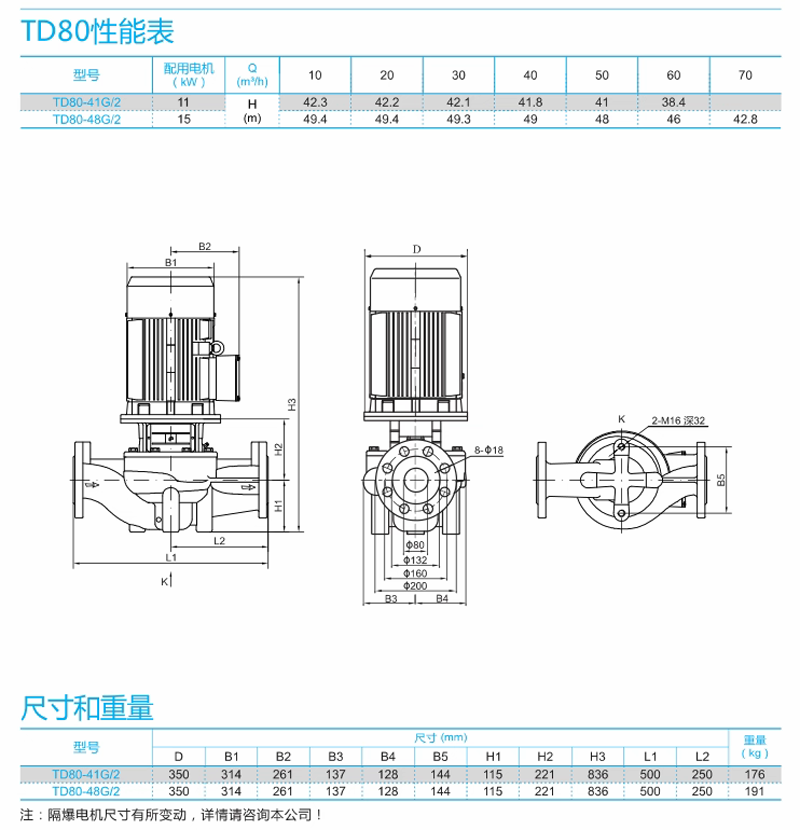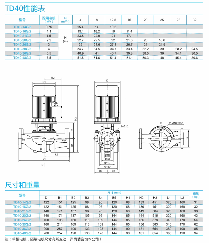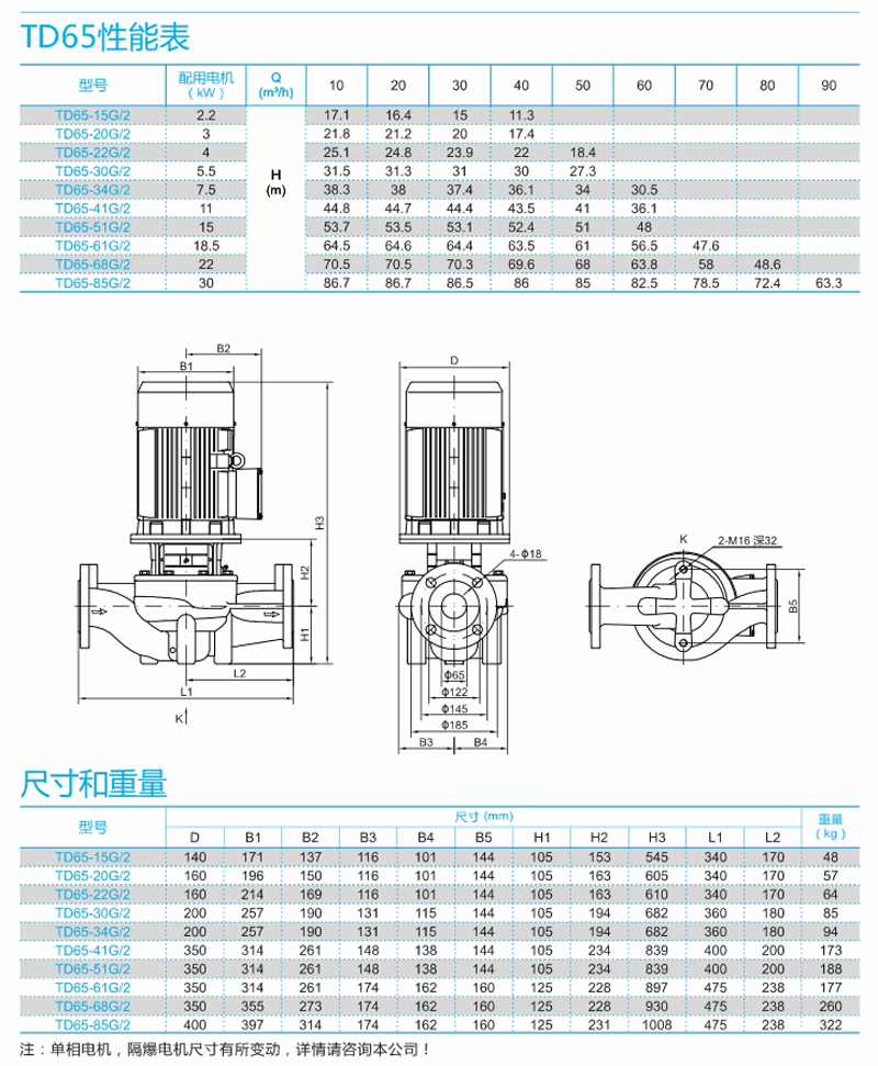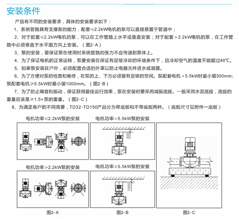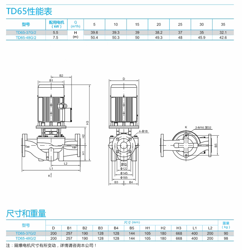 配有标准电机和机械密封,此类产品的结构与相近类型产品相 比,更不易受到泵送液体中杂质的影响。 产品设计为顶部可拉出的拆装形式,其可以在不影响管路系统的情况下对泵进行维修。 TD125和TD150产品同时提供加长轴结构和便拆式结构,TD200以上产品全部采用便拆式结构,更换机械密封无需拆卸电机。