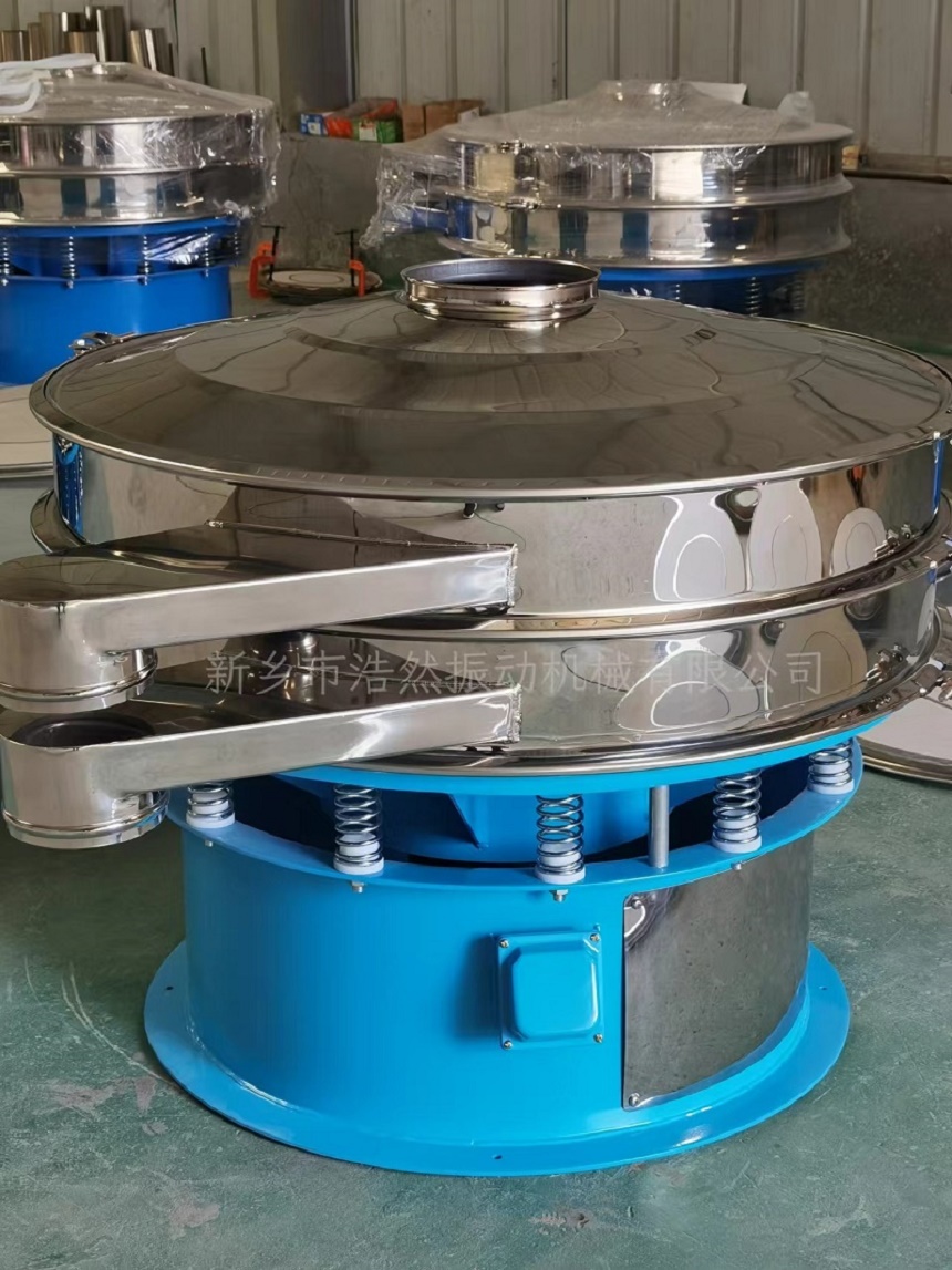 新乡市浩然振动机械有限公司关于:振动筛是一种高精度细粉筛分机械,其噪音低、效率高,快速换网需3-5分钟,全封闭结构,适用于粒、粉、粘液等物料的筛分过滤。旋振筛是由直立式电机作激振源,电机上、下两端安装有偏心重锤,将电机的旋转运动转变为水平、垂直、倾斜的三次元运动,再把这个运动传递给筛面。调节上、下两端的相位角,可以改变物料在筛面上的运动轨迹。    工作原理    旋振筛工作原理三次元旋振筛,由直立式电机作激振源,电机上、下两端安装有偏心重锤,将电机的旋转运动转变为水平、垂直、倾斜的三次元运动,再把这个运动传递给筛面,使物料在筛面上做外扩渐开线运动,故该系列振动筛称之为旋振动筛。旋振筛具有物料运行的轨迹长,筛面利用率高等优点,调节上、下两端重锤的相位角,可改变物料在筛面上的运动轨迹.可以对物料进行精筛分、概率筛分等。 旋振筛起动后,其动力装置即振动电机上下两端不同相位的偏心块、由于高速放置作用而产生一复合惯性力,该惯性力强迫筛机振动体作复旋运动,筛框在振动力的作用下连续作往复运动,进地而带动筛面作周期性振动,从而使筛面上的物料随筛箱一同作定向踊跃式运动,其间,小于筛面孔径的物料通过筛孔落到下层,成为筛下物,大于筛面孔径的物料经连续跳跃运动后从排料口排出,最终完成筛分工作。旋振筛振动体的运动轨迹为一复杂的空间三维曲线,此曲线在水平面上的投影为圆形,在两垂直面上的投影为两相同的椭圆。实际运用中,通过调整振动电机上下两端偏心块的相对相位,可以改变筛面上物料的运动轨迹,从而达到不同的筛分作业目的。    产品特点    1.体积小、重量轻、移动方便、出料口方向可任意调整,粗、细料自动排出,可自动化或人工作业。  2.筛分精度高、效率高,任何粉、粒、粘液类均可使用。  3.筛网不阻塞、粉末不飞扬、筛分最细可达500目(28微米)过滤最细可达5微米。  4.独特网架设计(子母式)、筛网使用长久、换网方便、仅需3—5分钟、操作简单、清洗方便。   5.无机械动作、保养简易、可单层或多层使用、与物料接触部位为用不锈钢制作(医药用除外)。                                                                                                                                                                                                                                                                                                                                                   新乡市浩然振动机械有限公司