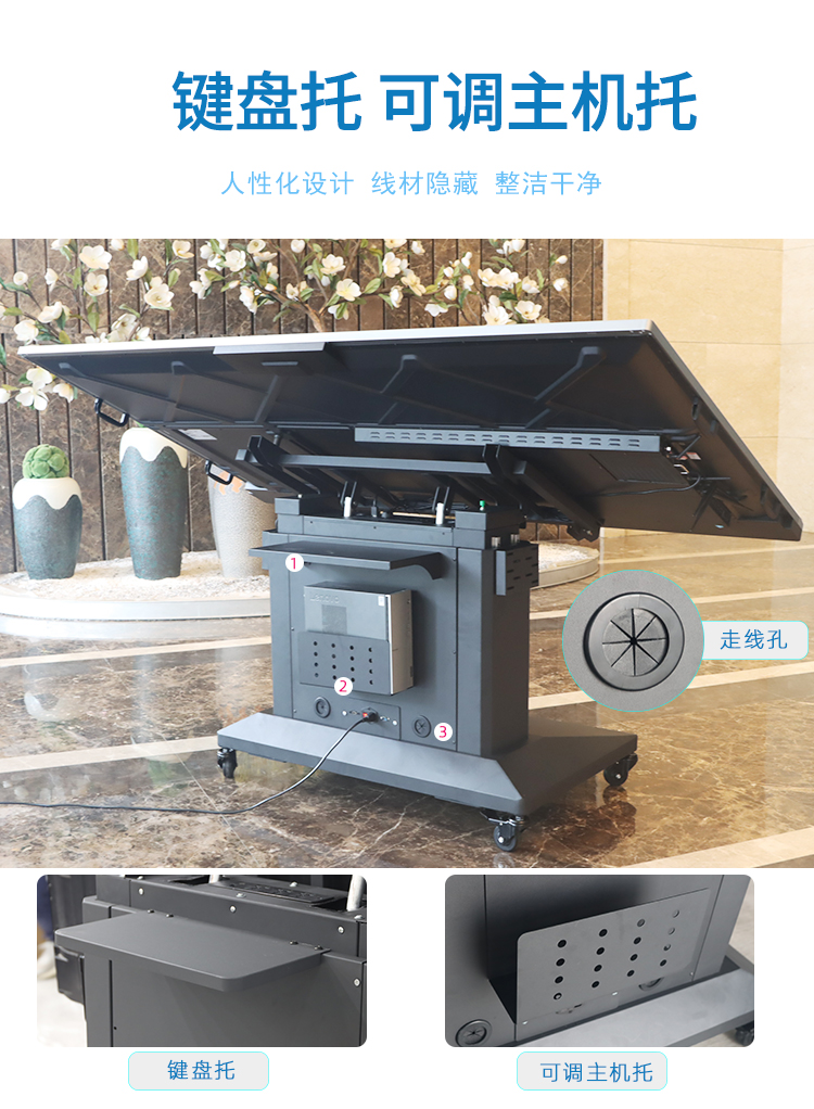 特点 | 电动升降 电动翻转 带主机托 键盘托 | ||