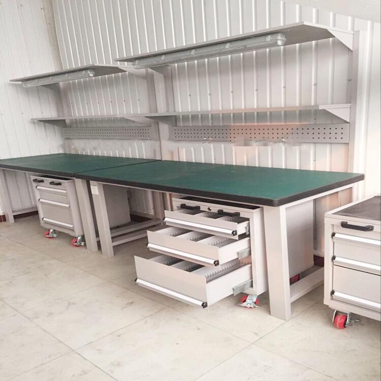 1.工作台使用于学校、车间流水线、钳工操作台、电子厂生产,等多种地方时使用.2.可以配带抽屉,柜子,灯架、挂板架、钳工台等设备配合生产。3.桌面有复合面、防静电面、榉木面、不锈钢面、钢包面等多种可供选择,根据需要的不同搭配不同的桌面。4.在抽屉上可以加配可以移动的分隔板,根据存放工具的大小来调整空间。5.工作台配带的工具柜可以选择是抽屉的、带柜子的,或是两者都有的。6.桌面承重1000Kg,可以根据不同的需求来调整材料,从而保证了承重.