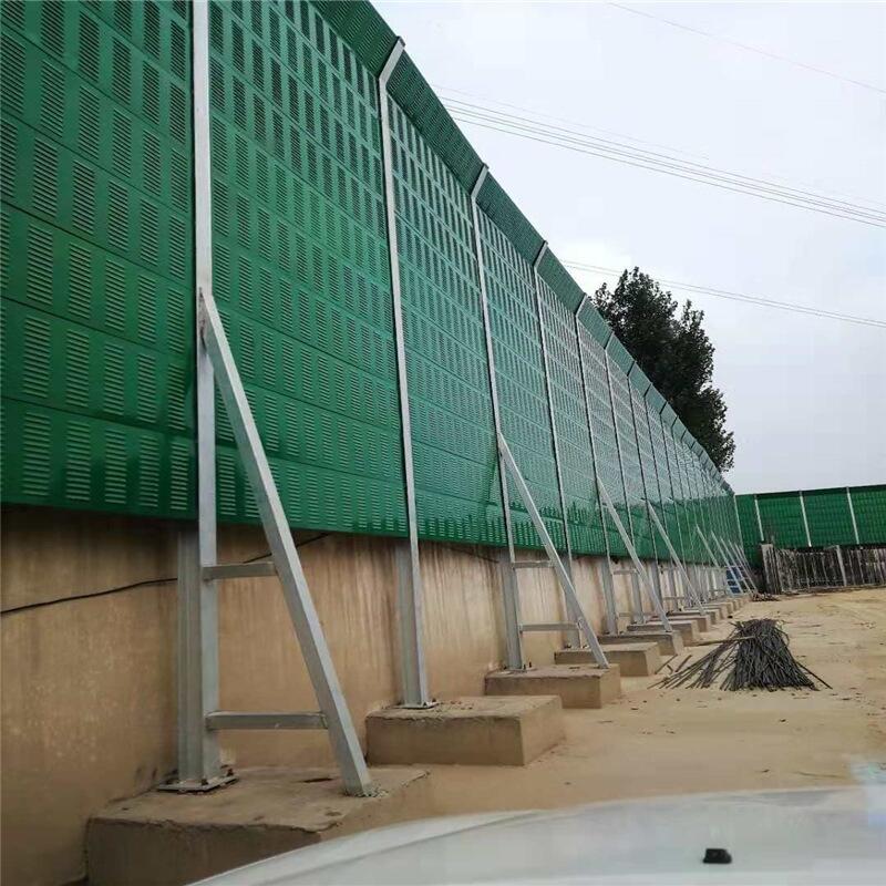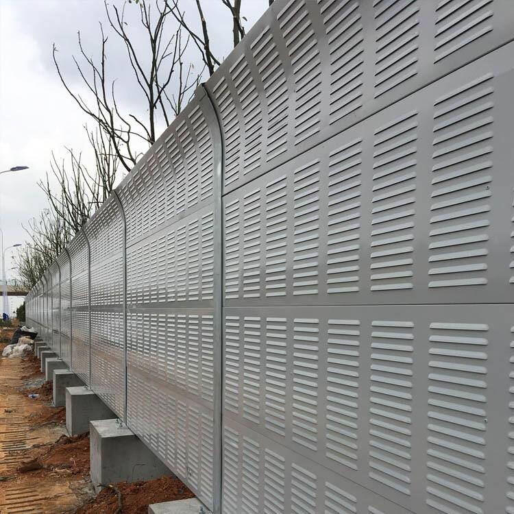 厂区隔音屏(声屏障)主要由钢结构立柱和吸隔声屏板两部分组成,立柱是隔音墙的主要受力构件,它通过螺栓或焊接固定在墙体或地面预埋钢板上;吸隔声板是主要的隔声吸声构件,它通过高强弹簧卡子将其固定在H型立柱槽内,形成隔音墙。