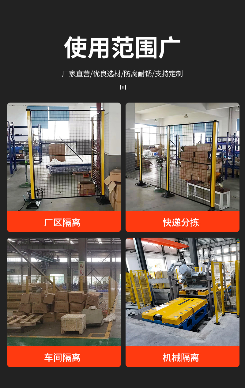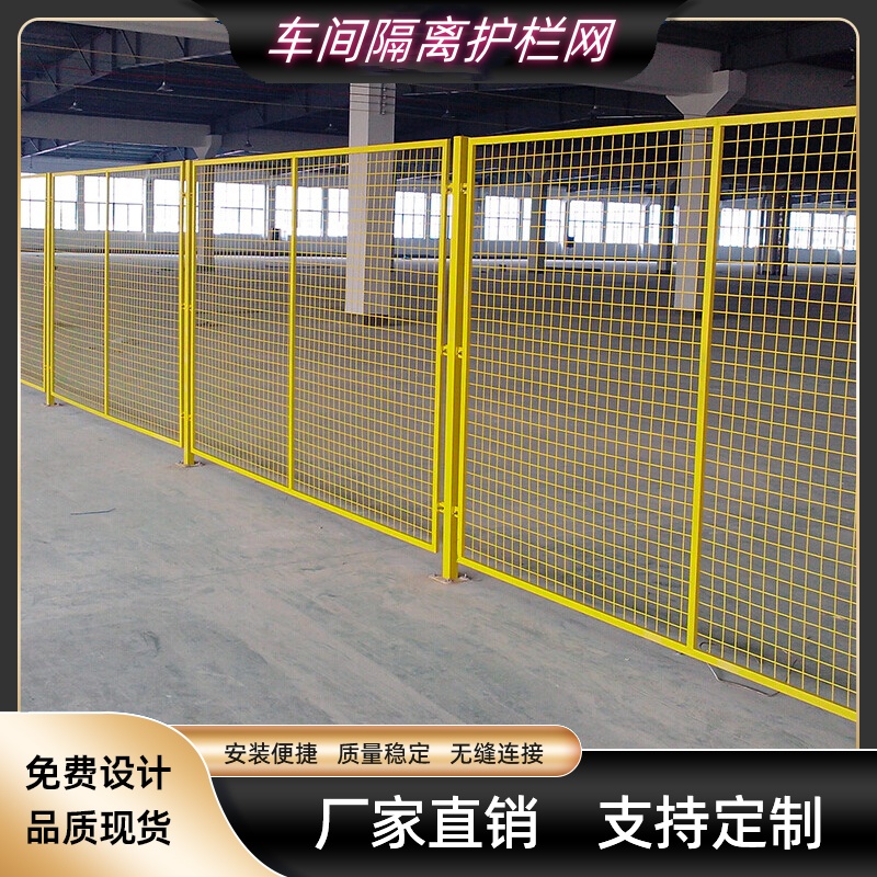 车间隔离栅特点: 广泛应用于车间仓库内部或市场摊位之间的隔离,重要机械部件的隔离防护。 采用热加塑工艺,涂层均匀丰满,色泽柔和艳丽,具有良好的绝缘、耐候和耐用性、*维护、具有较强的装饰性和良好的防护性。 安装速度快,安装简易可拆卸移动。 结构新颖、气派大方、整体美观性好。