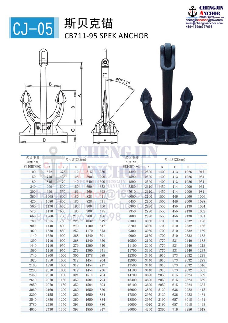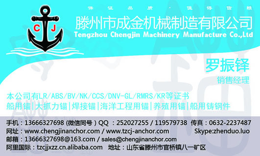 滕州成金船锚 生产斯贝克锚,霍尔锚,海-军锚,日本无杆锚,CJD-14 德尔塔大抓力锚(三角锚),CJT-20 (TW波尔)大抓力锚,CJ-17大抓力锚(MK5海工锚),丹福尔锚,我公司可提供ABS, BV, CCS, DNV, NK, GL, LR, RMRS, KR, 等普通锚船检证及大爪力锚船检证,欢迎订购!!