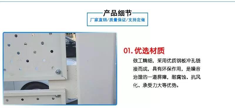 冲孔围挡结构是以冲孔板为主要材料的隔离网络,采用不同尺寸的网格、布置和表面处理,可制成不同类型的护栏网络,可用于控制公路、铁路、地铁等交通市政设施城市地区的环境隔音屏障、建筑物体墙、发电室、工厂等噪声源。冲孔围挡具有良好的透气性,也可用于沿海台风的防护。该产品具有坚固耐用、美观大方、防护性好等特点。