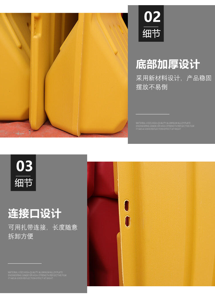 材质优:完全用优质PE原料制造,注水后更具缓冲弹性,能吸收强大的冲力有效地减少对汽车、路人及围栏内工作人员的伤害。颜色鲜明,可根据道路要求选择不同颜色,清楚明确地指示行车路线。串连使用,整体承受力更强。