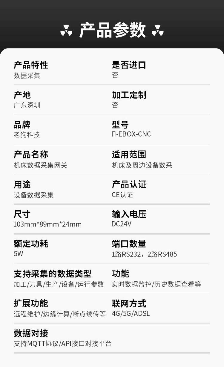 支持采集的数据类型 | 加工/刀具/生产/设备/运行参数 | ||