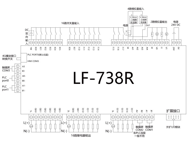 DO开关量输出 | 16路继电器输出2A 250VAC | ||