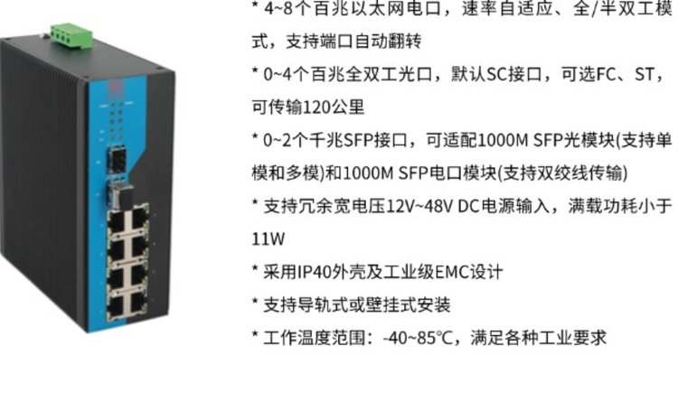 特点 | 4~8个百兆以太网电口,速率自适应、全/半双工模式,MDI/MDI-X自适应 | ||