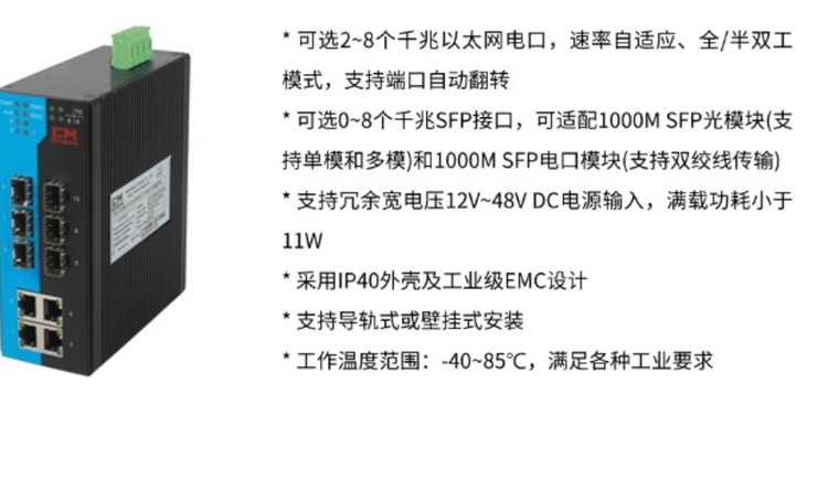 特点 | 2~8个千兆以太网电口,速率自适应、全/半双工模式,MDI/MDI-X自适应 | ||