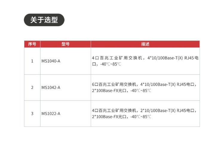 特点 | 2~4个百兆以太网电口,速率自侦测、全/半双工模式,支持端口自动翻转 | ||