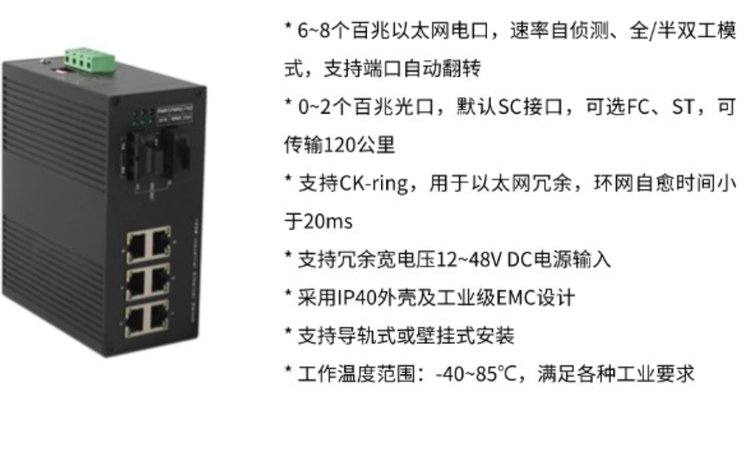 特点 | 6~8个百兆以太网电口,速率自侦测、全/半双工模式,支持端口自动翻转 | ||
