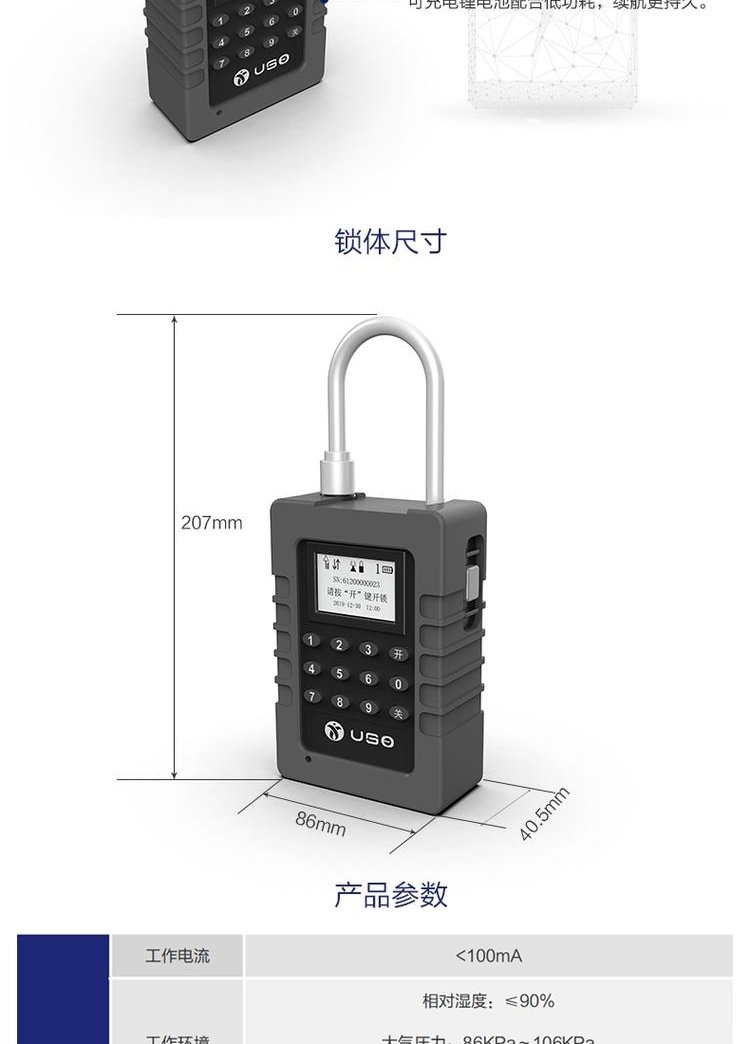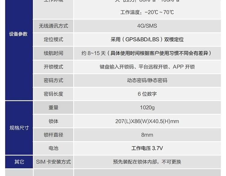 报警功能 | 非法开锁报警、非法拆壳报警、低电量报警、偏航报警、围栏报警 | ||