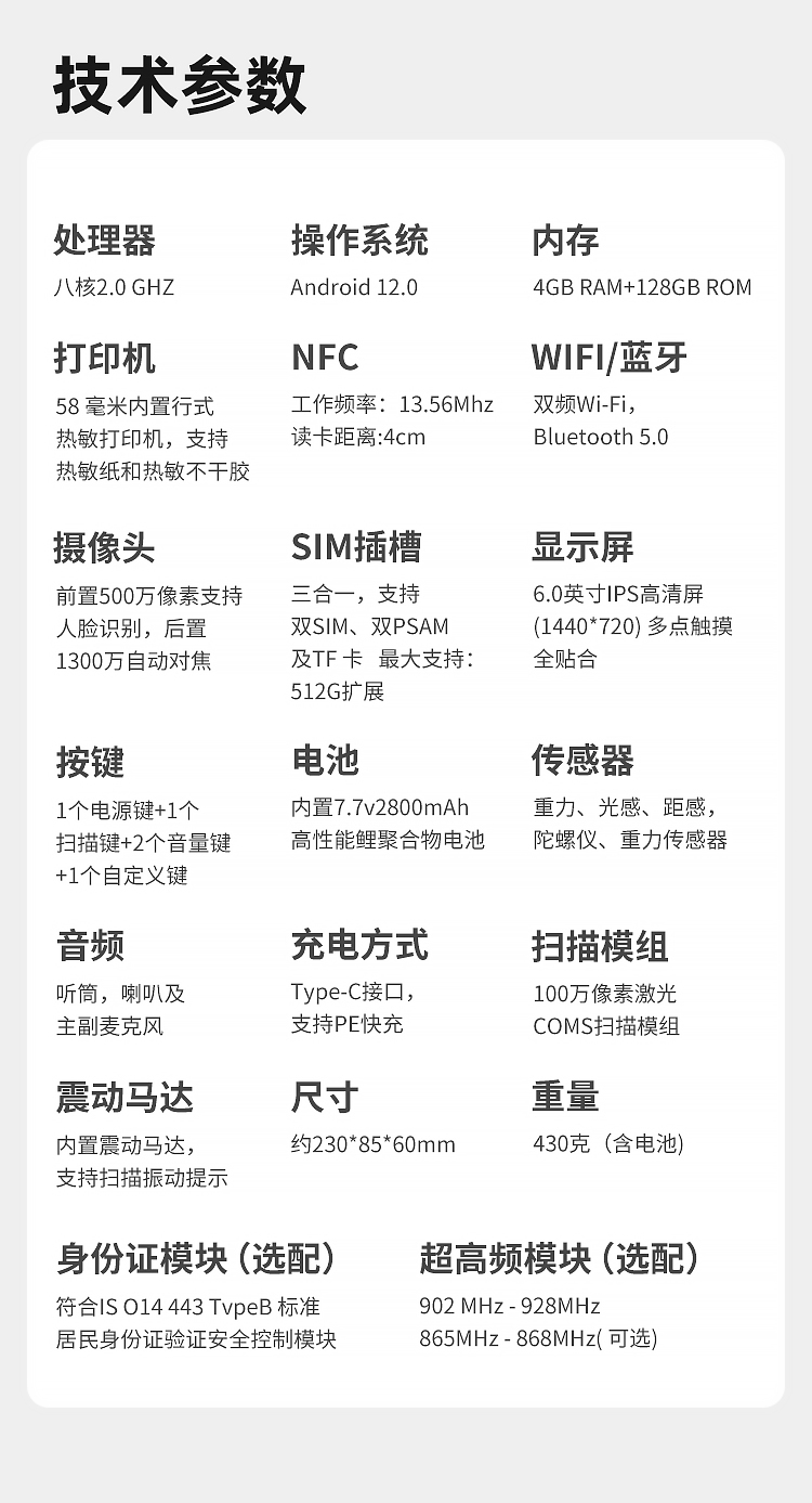 物理按键 | 扫描键 / 电源键 / 自定义键 | ||