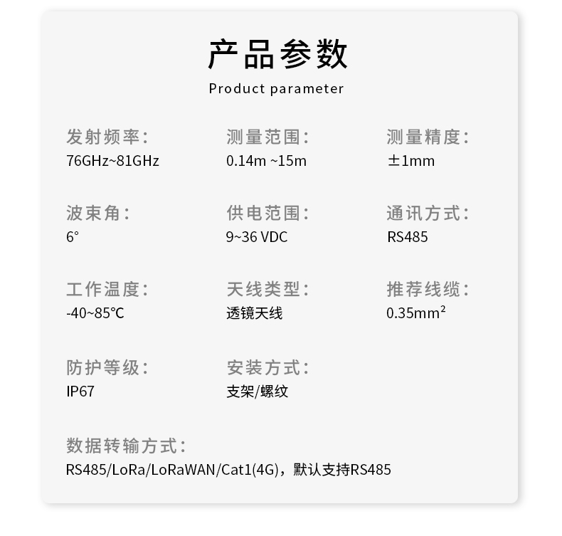 80G高频无线CAT1/LoRawan/RS485雷达物位液位计水位变送器 是否支持加工定制 | 否 | ||