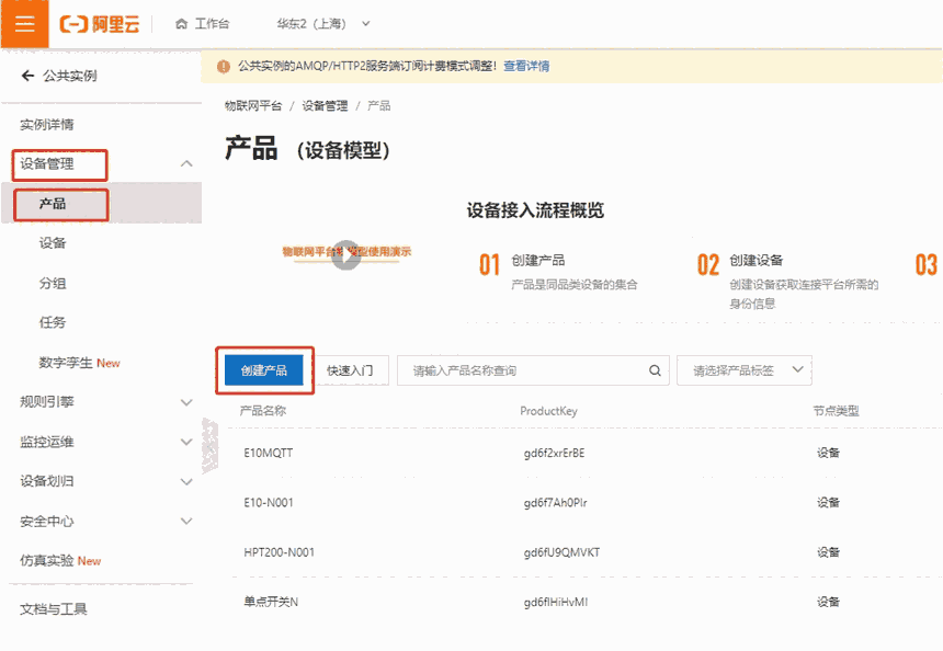 2、登录后,选择 产品-->物联网-->物联网平台 点击物联网平台