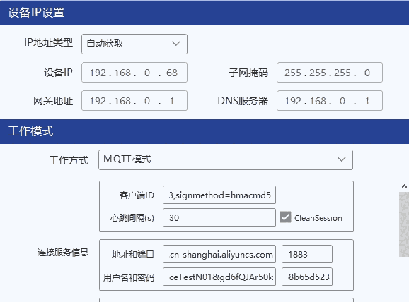 3、地址和端口:生成器生成的mqttAddress,示例:gd6fQJAr50k.iot-as-mqtt.cn-shanghai.aliyuncs.com 端口默认:1883