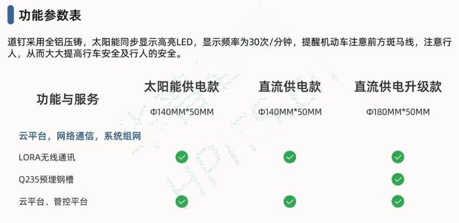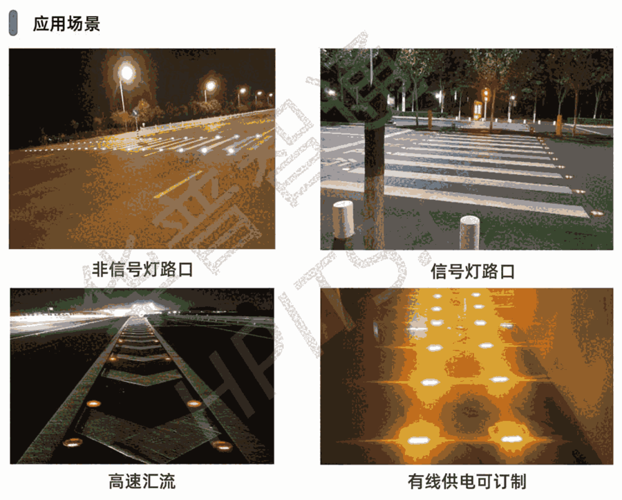 道钉采用全铝压铸,可以实现同步,交替控制;显示高亮LED,显示频率为30次/分钟,60次/分钟,提醒机动车注意前方斑马线,注意行人,从而大大提高行车安全及行人的安全。