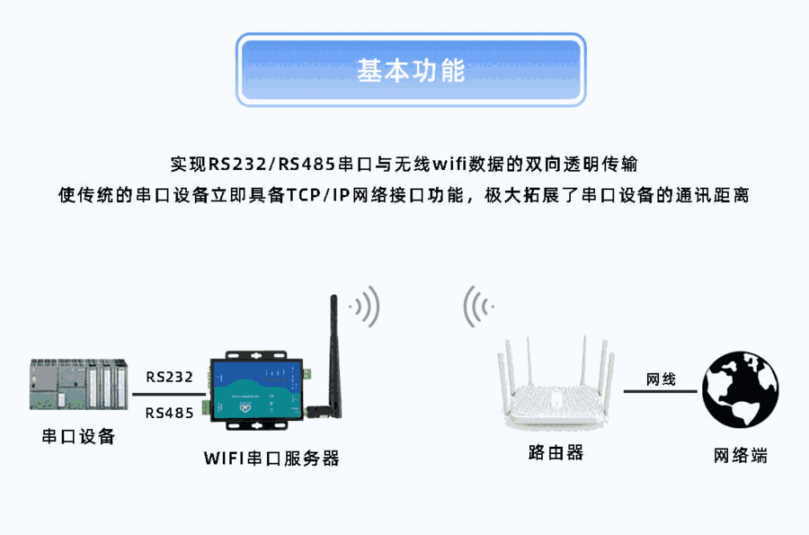 提供串口转WIFI、串口转以太网、以太网转WIFI功能,能够将串口(RS232/485)转换成TCP/IP网络接口,实现串口(RS232/485)与WIFI/以太网的数据双向透明传输。使得串口设备能够立即具备TCP/IP网络接口功能,连接网络进行数据通信,极大的扩展串口设备的通信距离。