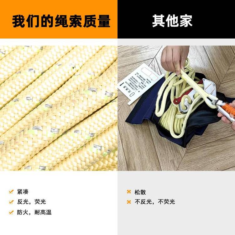 包装清单 | ①、7.5mm应急逃生自救安全绳*20m ②、中空连接扁绳*1 ③、轻型安全钩*2 ④、高频弯折成型抓结*1 ⑤、绳包*1 | ||
