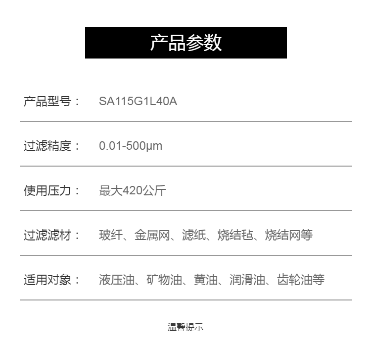 滤材 | 玻纤、金属网、滤纸、烧结毡、烧结网、粉末烧结、聚丙烯 | ||