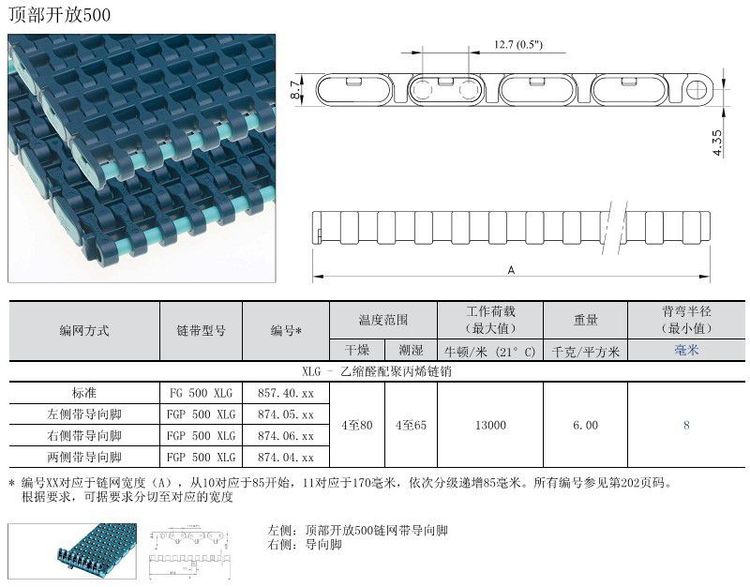 500顶部开放链网,有16开放区域;水和气流的流通性,使污物掉落,并在产品和链网之间维持一个干净的接触面。适用于罐头制造和罐头加工。