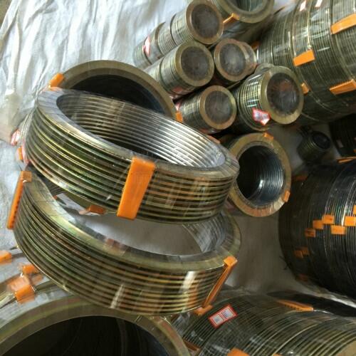 金属缠绕垫片(基本型)采用优质SUS304、SUS316(“V”形或“W”形) 金属带及其它合金材料与温石棉、柔性石墨、聚四氟、非石棉纤维等软性材料相互重叠螺旋缠绕而成,在开始及末端用点焊方式将金属带固定。