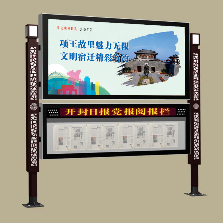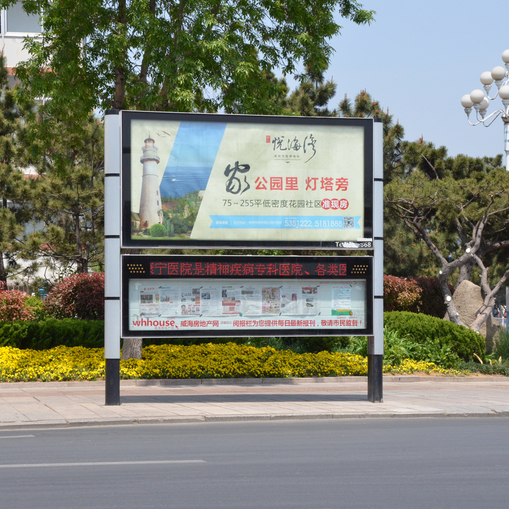 人流大的地方或路口建议安装滚动广告灯箱,灯箱越大越好,上限尺寸宽5米,高2米,三幅画面轮流滚动展示。小于这个尺寸的滚动系统可以安装6幅广告画面,手机操作控制方便安全。