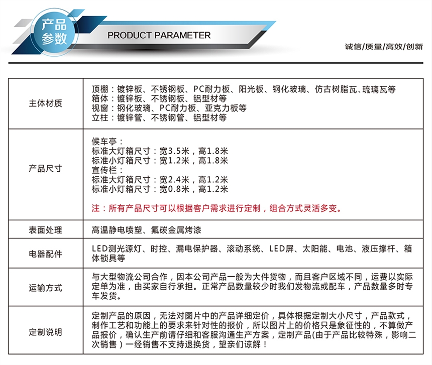 选配功能:照明系统、数字换画(滚动)系统、LED显示屏、储电系统(电瓶)、太阳能供电系统、液压开启等。