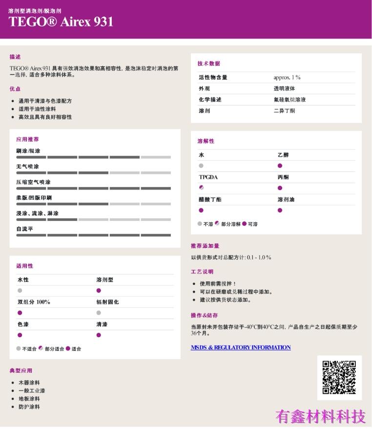 迪高TEGO®Airex931用于低极至高极性涂料体系的脱泡剂、高效,与清漆具有良好的相容性,适用于溶剂型涂料体系。