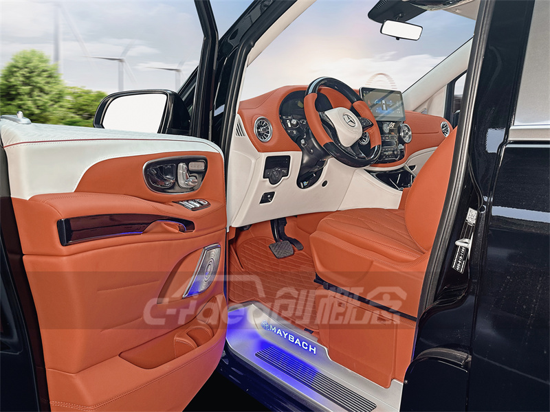 随着电动侧门开启,大家可以看到整个内饰采用了棕白双拼色设计,给人感觉大方沉稳又不乏味。而且车内还定制了全隔断吧台设计,并搭配有电动升降的液晶电视,各种娱乐功能应有尽有,在既开拓视野的同时,又能达到车主对于娱乐的需求,使乘坐人员在旅程中更舒适惬意。并且中排加装的航空座椅具有多项智能调节功能,按键就安装在扶手边上,可启动:高低,前后调节,头枕,腰托,脚托,按摩,通风,加热等功能。 zui 后改装厂还在顶棚处加装豪华迈巴赫造型顶灯及条形氛围灯,乘客可以随时启动变色模式,切换多种颜色,为车内营造浪漫氛围。WJJ230714XWC