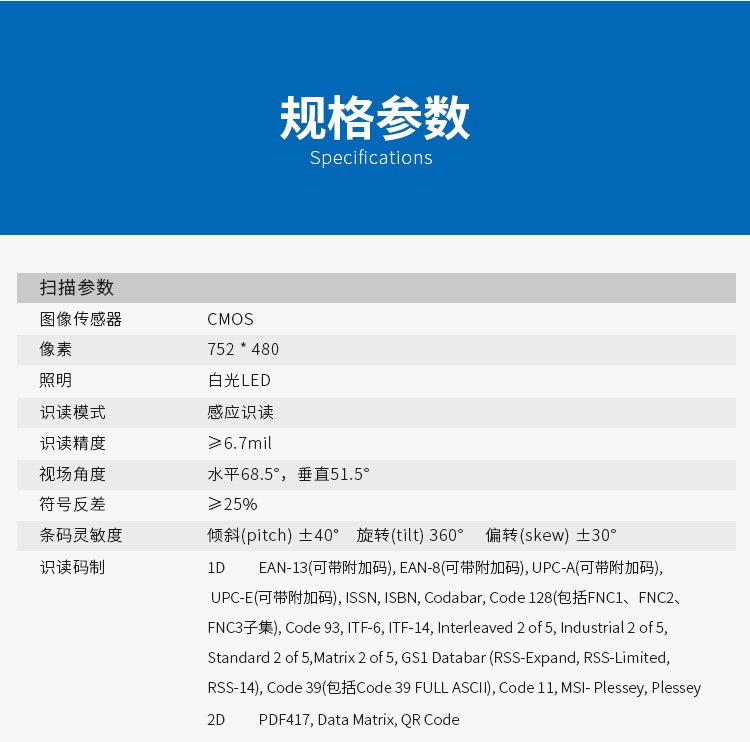 条码灵敏度 | 倾斜(pitch)±40° 旋转(tilt)360° 偏转(skew)±30° | ||