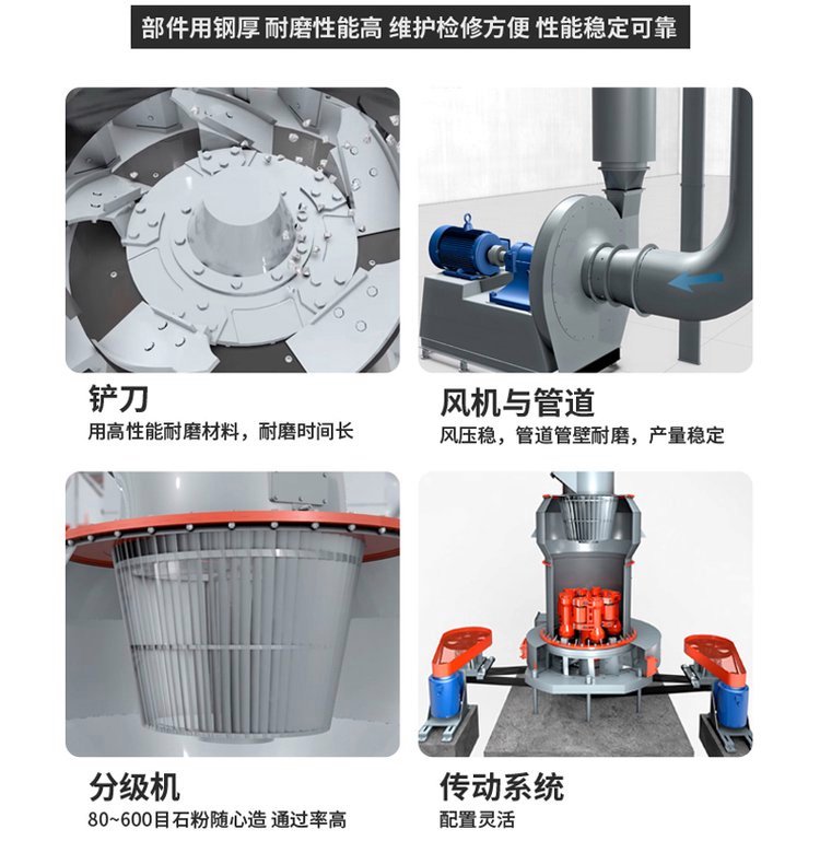 五、磨碎的粉末被鼓风机的气流吹到主机上方的分级机进行分筛,该强制涡轮分级系统分级精度高,粒度精细,成品细度可在0.18-0.038mm之间任意调节。(对话框:分级效率高、精度细)