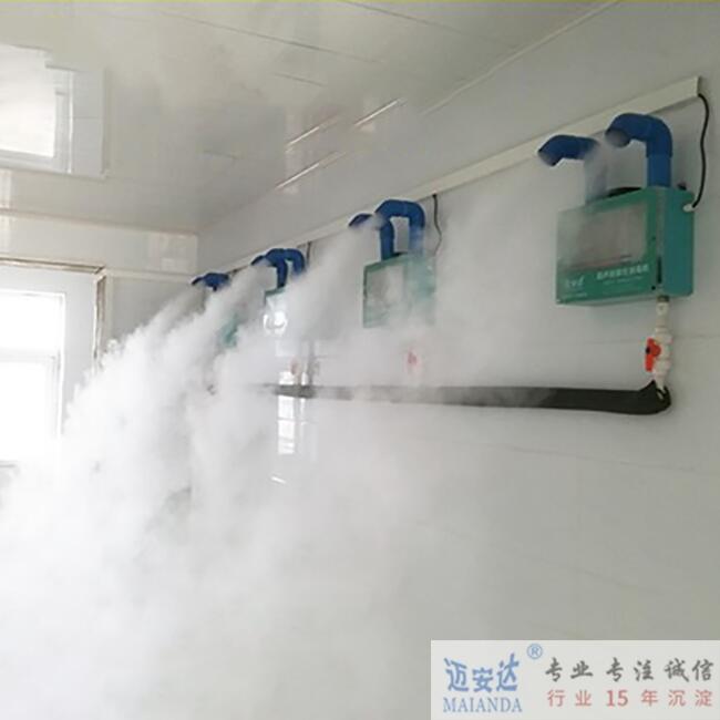 经过超声波震荡技术对水进行震荡,变成水雾形状,由风机吹出,在中水加入消毒液就能起到消毒的效果。