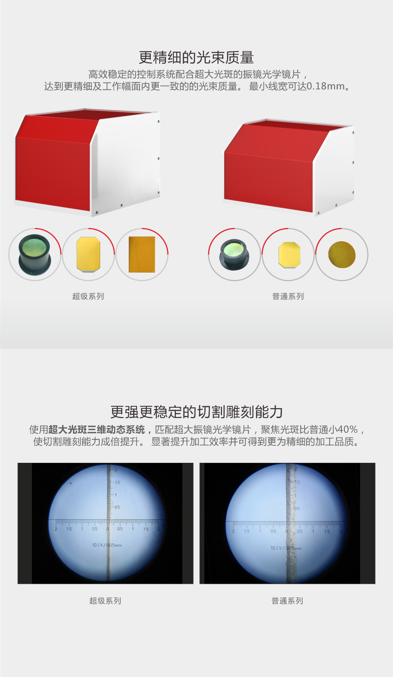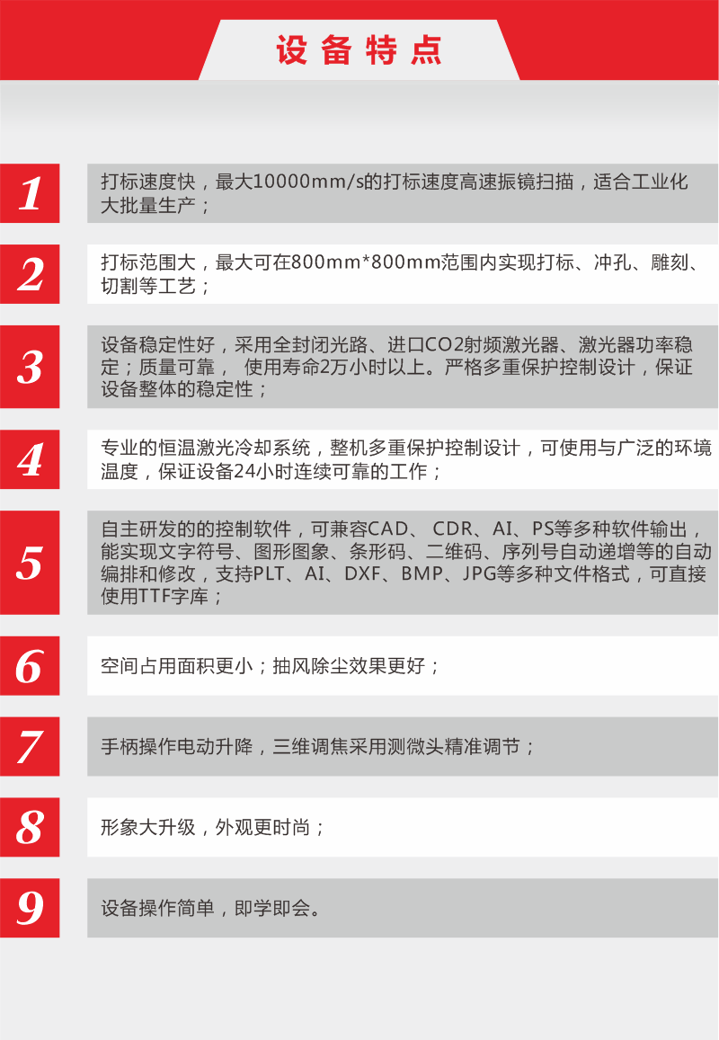 3、设备稳定性好,采用全封闭光路、进口CO2射频激光器、激光器功率稳定;质量可靠, 使用寿命2万小时以上。严格多重保护控制设计,保证设备整体的稳定性;