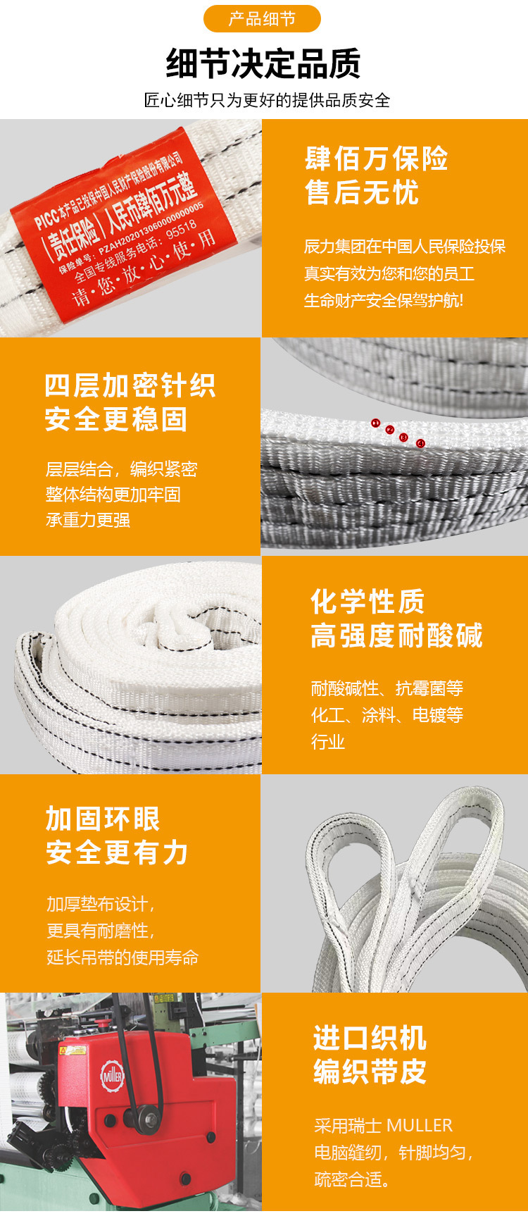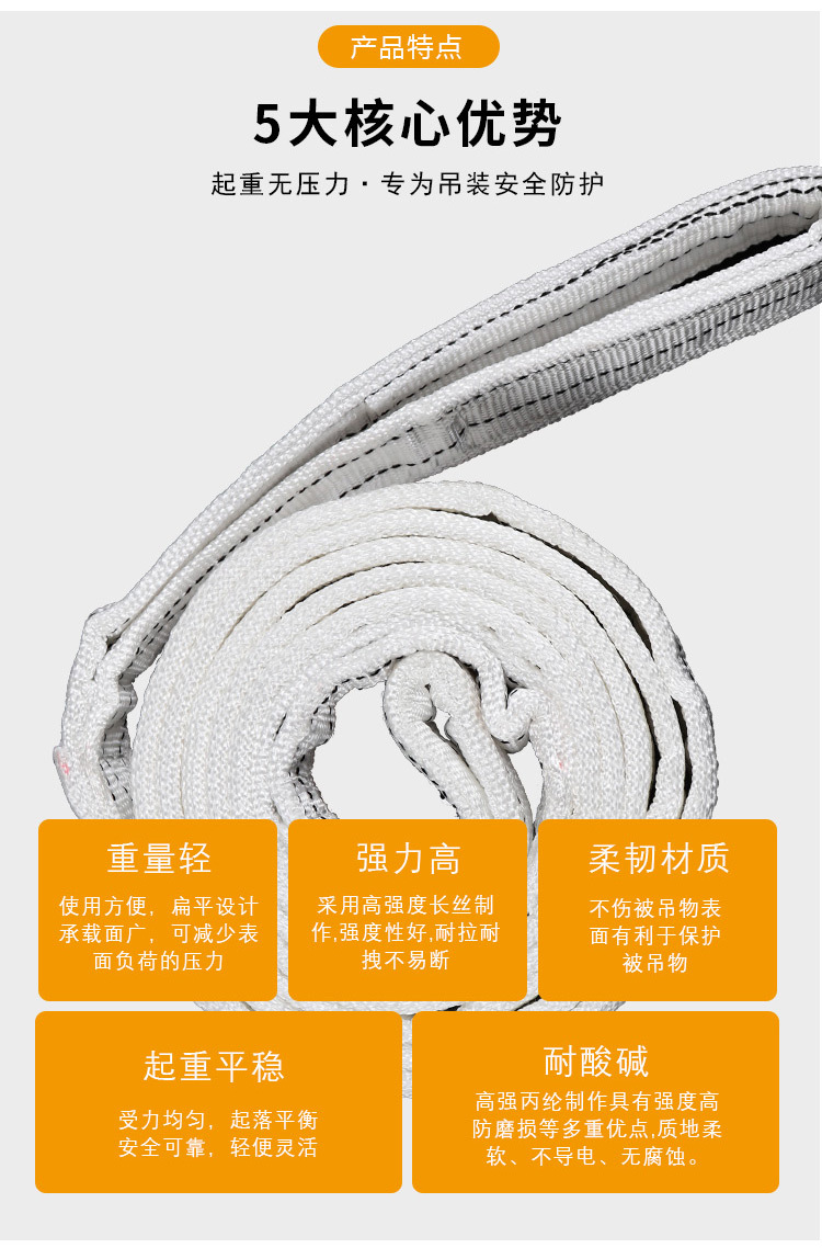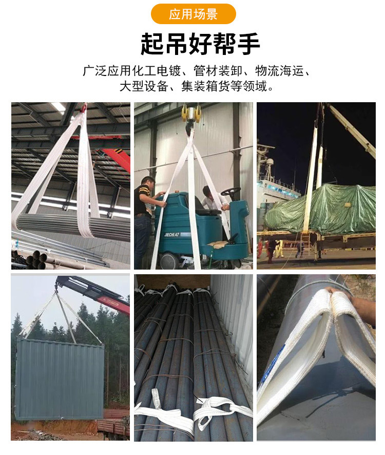 ★扁平吊装带是采用PES通过编制缝合制成,并且吊装的两端可使用加强的环眼或金属配件来增加强度。