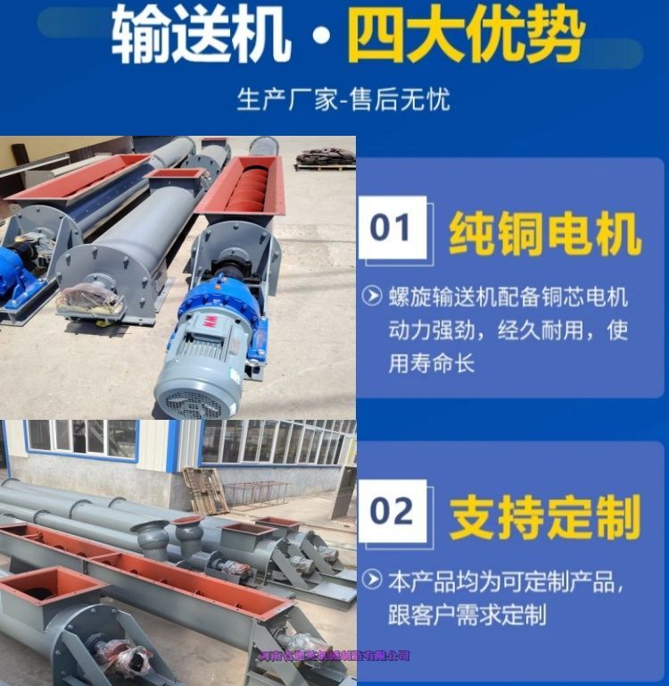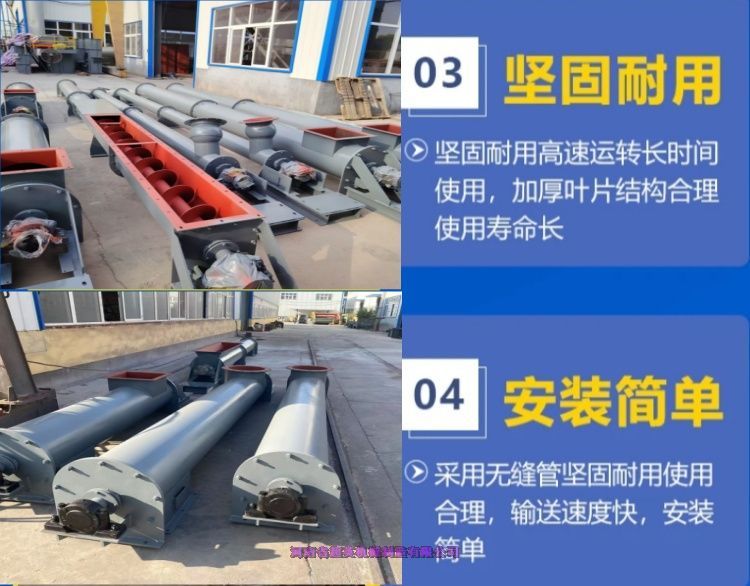 螺旋绞龙等效采用ISO1050-75标准,设计制造符合ZBJ81005.1~2-88《 GX螺旋绞龙 》标准。螺旋绞龙直径由100mm~1250mm,共十二种规格,分为单驱动和双驱动两种形式,单驱动螺旋机大长度可达40m(特大型30m),双驱动螺旋绞龙采用中间断开轴结构,大长度可达80m(特大型60m),螺旋绞龙长度每 0.5m 一档,可根据需要选定,螺旋机头部轴承、尾部轴承置于壳体外部减少了灰尘对轴承室的侵入了螺旋机关键件的使用寿命。中间吊轴承采用滚动、滑动可互换的两种结构,阻力小、密封性强、耐磨性好。